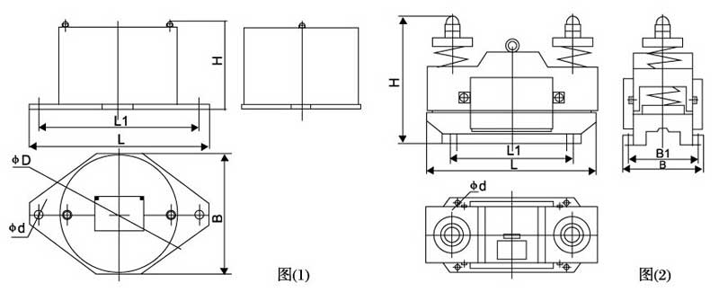 外型尺寸如圖:圖(2)為CZ250、CZ400、CZ600、CZ800、CZ1000型螺旋彈簧倉(cāng)振器,圖(1)為CZ10型、CZ50、CZ100型環(huán)氧板簧倉(cāng)壁振器。